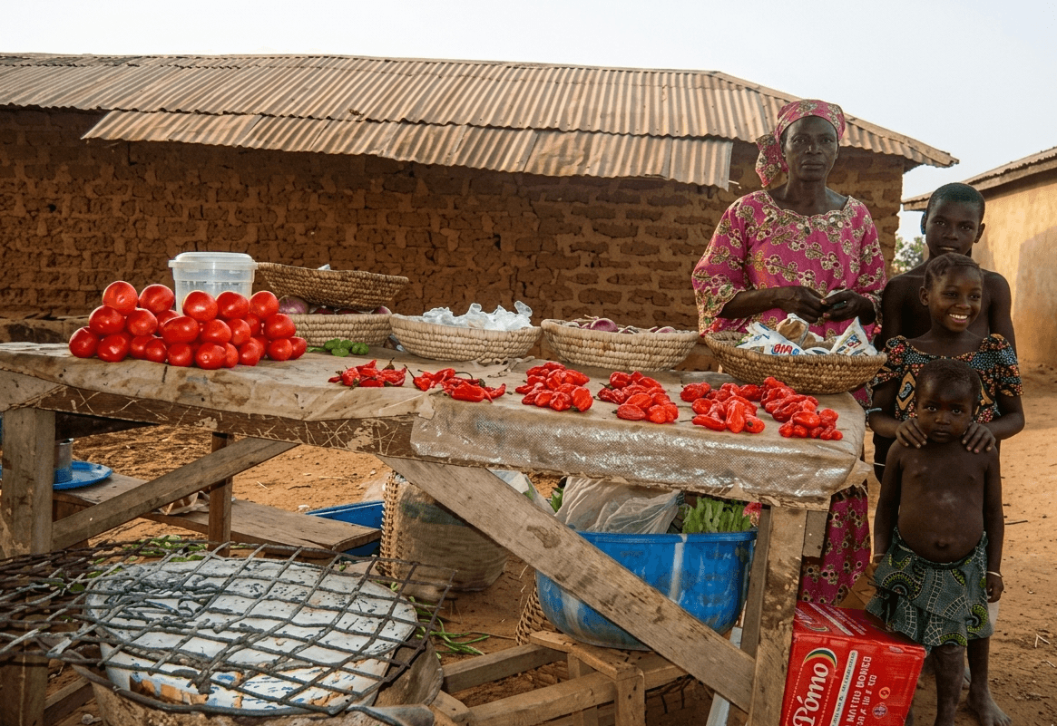 Today, Mama Aisha is a thriving entrepreneur. The attached image shows her at her well-stocked stall, proudly displaying fresh produce including tomatoes and peppers.
